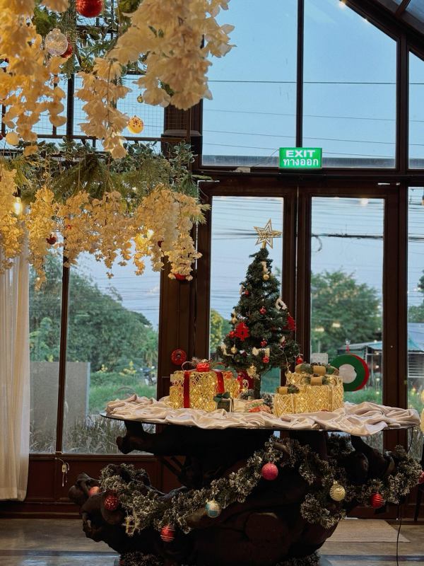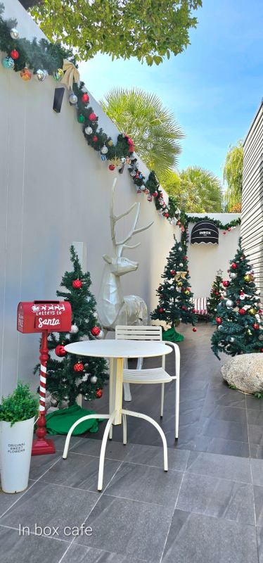 อีกหนึ่งคาเฟ่ดีไซน์สวย ในบรรยากาศร่มรื่น สวยงาม กับ In box café ที่ตกแต่งคริสต์มาสเข้ากับธรรมชาติได้อย่างลงตัว และสวยงามสุดๆ ที่นี่มีอาหารและเครื่องดื่มแสนอร่อยหลากหลายเมนู ทั้งคาว หวาน ให้คุณได้อิ่มอร่อยและเพลิดเพลินกับบรรยากาศผ่อนคลาย ใครสายถ่ายรูปก็แฮปปี้แน่นอน เพราะมีหลากหลายมุมให้ได้รูปสวยๆฟินๆ และที่สำคัญที่นี่มีห้องสำหรับจัดเวิร์คชอป ประชุม สัมมนา หรือจัดปาร์ตี้วันเกิดได้อีกด้วย เป็นอีกหนึ่งคาเฟ่สวยที่พลาดไม่ได้เลยค่ะ